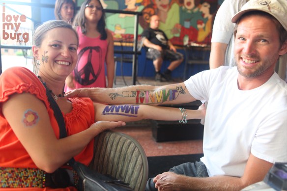 The event welcomed folks of all ages. Kids could draw with sidewalk chalk, blow bubbles, get their faces painted, or join the coloring contest. Brandy and Denise had made special coloring pages of the Art Lotto sponsors and donors–like one of Miranda Lancaster from The Yellow Button, and one of Chris Clark, and one of Brent Levy and Amanda Garber from Rise. But, sorry–and this is not a comment about Amanda’s appearance, we all know she’s gorgeous–on the coloring page, she looked like Moe Doodle. Just sayin’. <cringe>