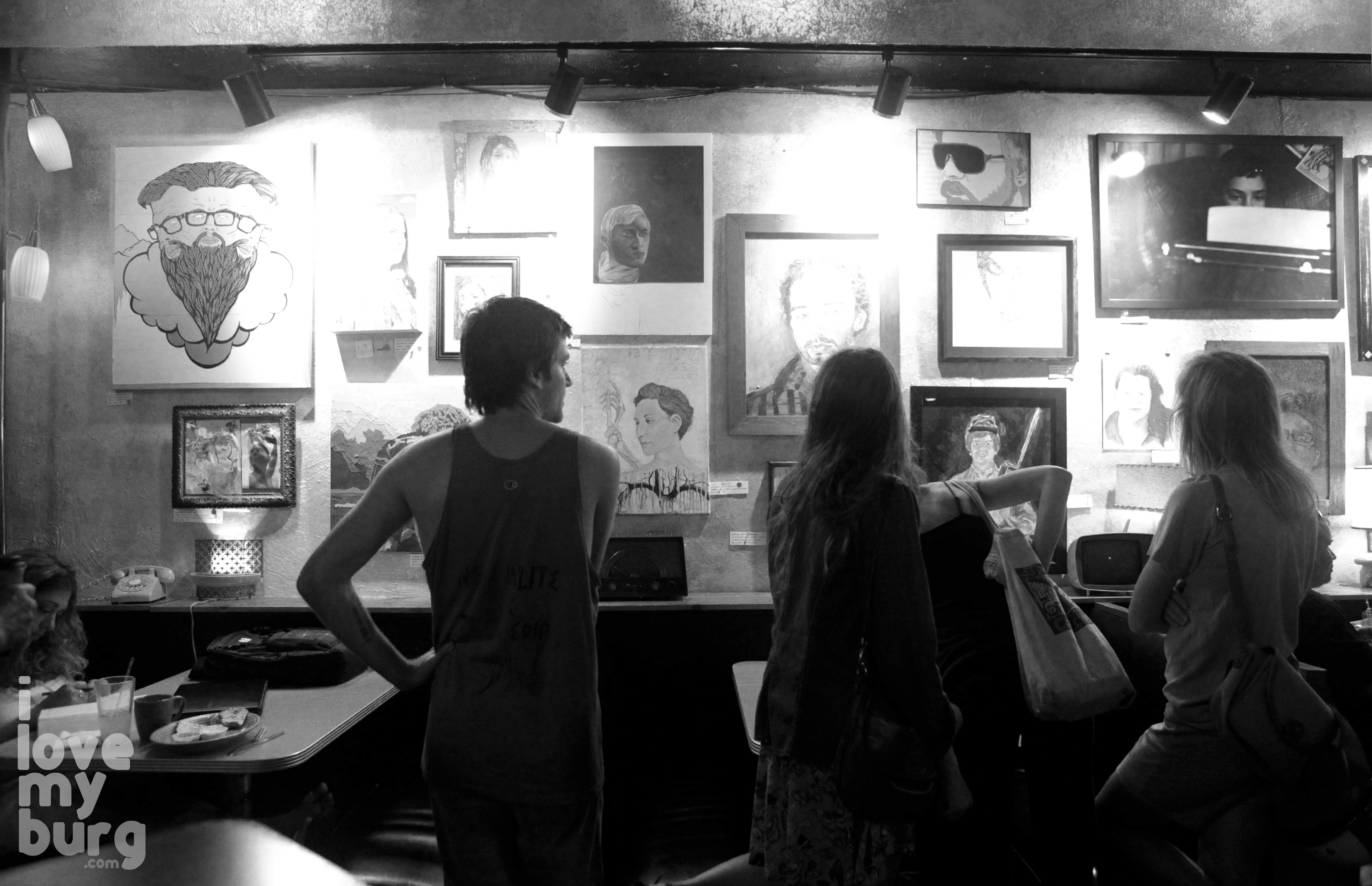 I made my way to the Dodger at about 12:30 Wednesday to serve as a judge for Art Lotto. Ballot and freshly sharpened pencil in hand, glasses on, I browsed the forty-three portraits hanging starkly on the wall. The simple and well-organized ballot employed a numerical scoring system… easy enough. But as I stood there gazing at those portraits, I felt a paralysis come over me. I heard other customers, who were also visibly impressed by the display, make comments like, “This is unbelievable.” “I can’t believe how great these are.” “What an amazing idea–who came up with this?” and “So powerful–all these faces…”